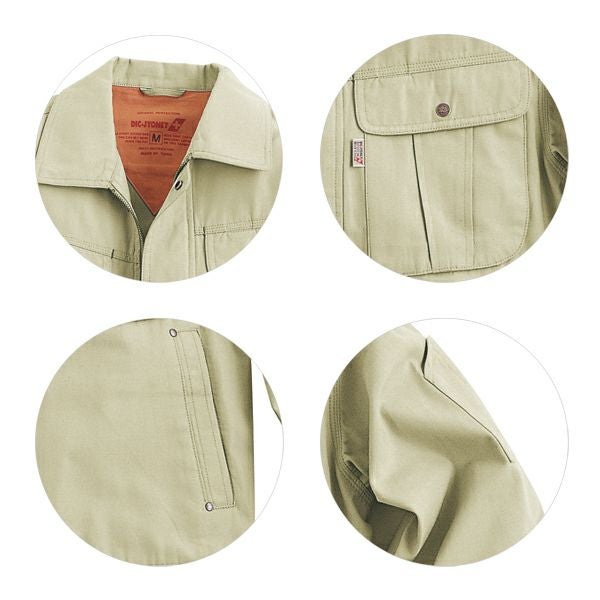 1、左袖・左胸ペン差し 2、ノーフォーク 3、赤のカン止め 4、金属ボタン 5、3本ステッチ 6、リベット 7、帯アジャスター 8、携帯すぐTELポケット(特許出願中) 9、2層構造系 10、形態安定性 |