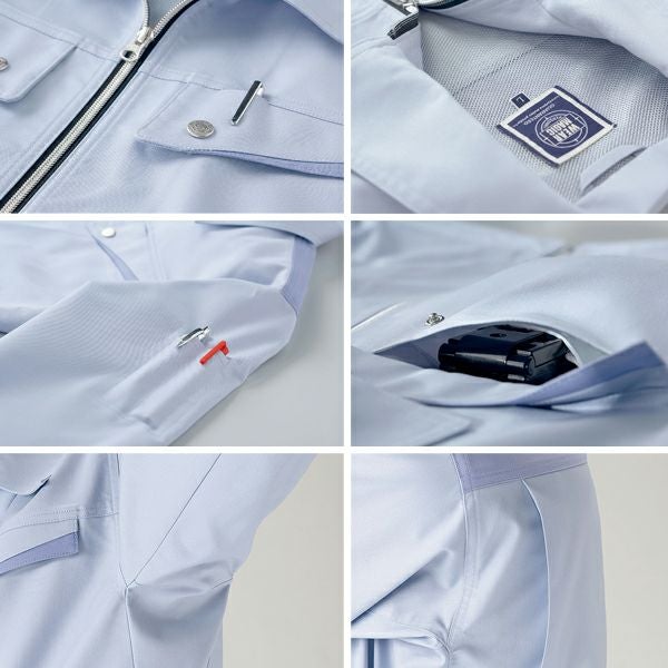 1、脇がつっぱらない!リラックスカット 2、ノーフォーク 3、背当メッシュ 4、右胸内携帯ポケット 5、左胸ペン差し 6、左袖ペン差し 7、制電素材 8、ストレッチ素材 9、リサイクル素材 10、ECOストレッチ・二重織 |