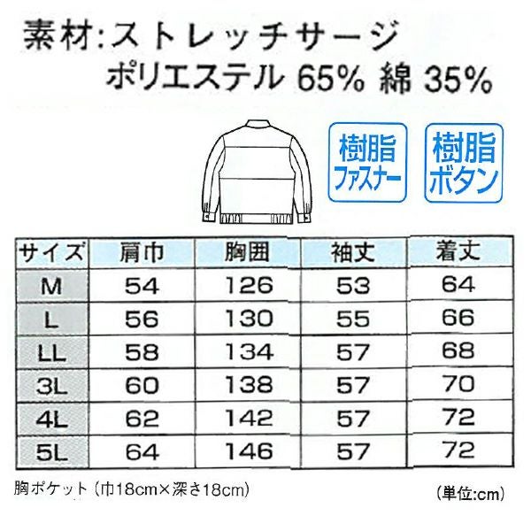 | 特徴 | 1、帯電防止 2、ストレッチ 3、ソフト風合い 4、撥水 5、年間対応 6、樹脂ファスナー 7、樹脂ボタン 8、ポケットマジックテープ付 9、携帯電話収納ポケット付(左胸ポケット) 10、雨や汚れた水をはじく撥水加工 |