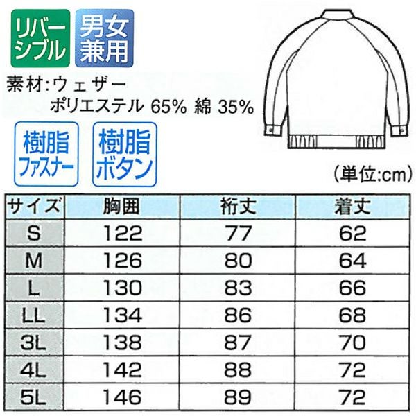 | 特徴 | 1、リバーシブル 2、左胸に便利なペン差し付。 3、樹脂ファスナー 4、樹脂ボタン 5、男女兼用 |