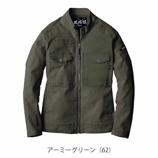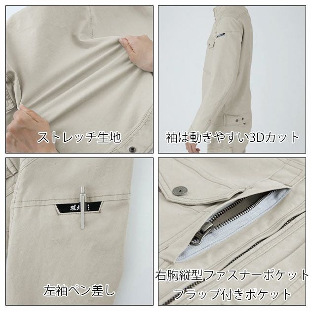 | 【特徴】 | 粗い加工を施した生地はユーズド感演出! ドビー織りならではの凹凸感でハードな見た目に。 さらにポリウレタンで抜群のストレッチを実現し、動きやすい作業服に。 ◆超伸びストレッチ ◆袖は動きやすい3Dカット ◆左袖ペン差し ◆右胸縦型ファスナーポケット・フラップ付きポケットのダブルポケット ◆袖口は2段階に調整できるアジャスター付き ◆裾は金属製アジャストボタン付き |