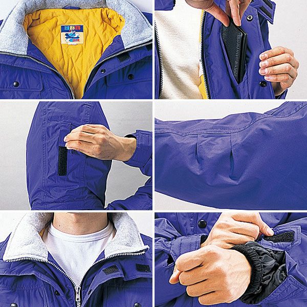 1、フードアジャスター 2、衿フリース仕様 3、胴裏 4、二重衿仕様 5、内ポケット 6、肘タック 7、袖口アジャスター 8、裏縫い目止め・目張り加工 9、帯電防止素材使用 10、撥水加工 11、透湿防水 12、防風防水防寒 |