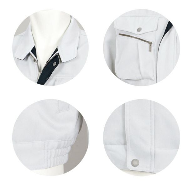 1、携帯電話入ポケット、ファスナー付ポケット 2、左胸ペン差し 3、内ポケット 4、左袖ペン差し 5、両側ポケットマチ付 6、ノーフォーク 7、帯電防止素材使用 8、形態安定性 9、ストレッチ |