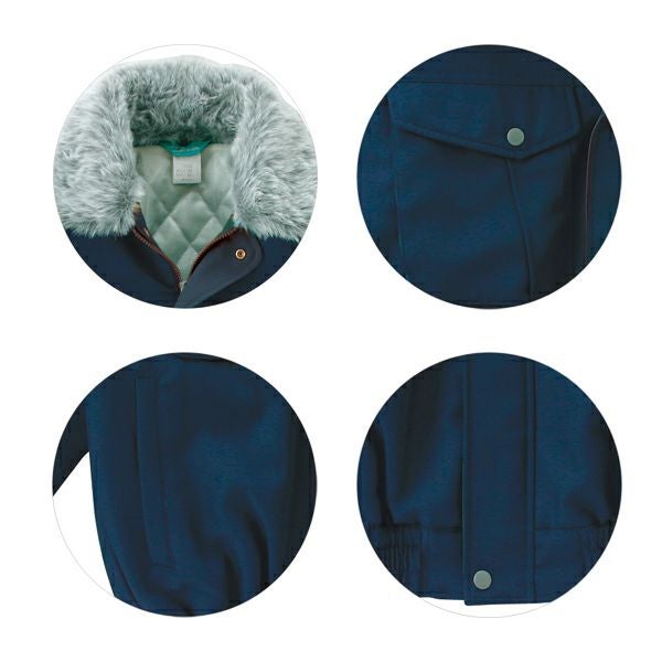 1、携帯電話入れ胸ポケット仕様 2、衿ボア脱着式 3、内ポケット仕様 4、袖口調節ボタン 5、両胸ポケットマチ仕様 6、中綿(アルミ蒸着キルト) 7、撥水 8、脱着式フード(オプション) 9、左胸ペン差し |
