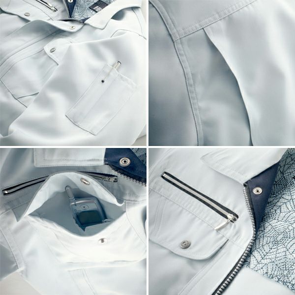 1、背当メッシュ 2、ノーフォーク 3、右胸内携帯ポケット 4、右胸Wポケット 5、左袖ペン差し 6、制電素材 7、ポリエステル100% |
