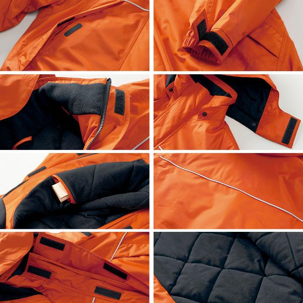 1、着脱式フード 2、左右胸ポケット 3、衿裏フリース 4、背反射テープ 5、左内ポケット 6、袖マジックテープ 7、裏地/トリコットキルト 8、胸反射テープ 9、防水防寒・耐水圧2,000mm |