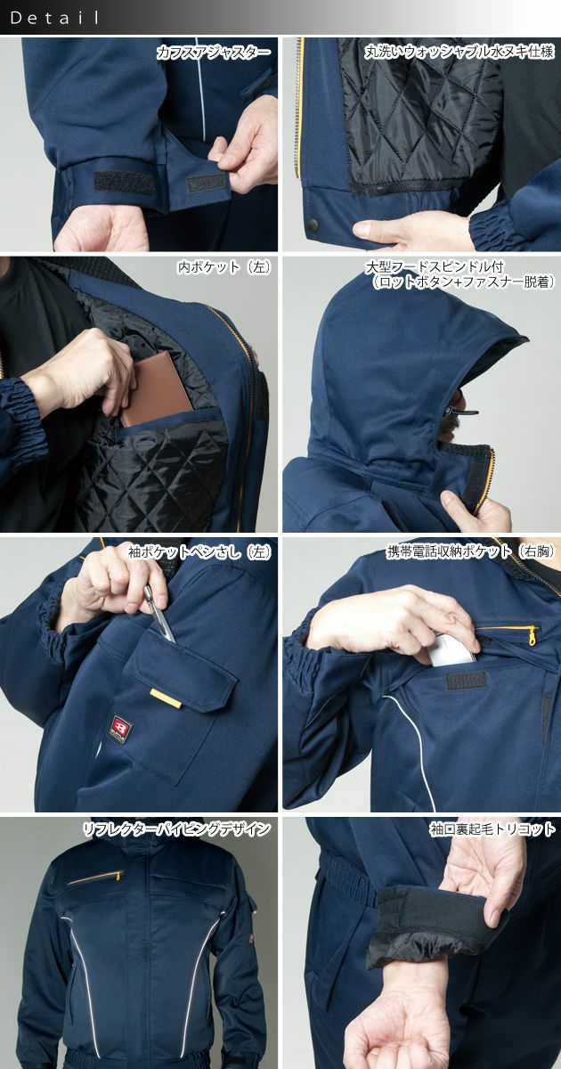 | 特徴 | 1:大型フードスピンドル付(ロットボタン+ファスナー脱着) 2:カフスアジャスター 3:袖口裏起毛トリコット 4:リフレクターパイピングデザイン 5:携帯電話収納ポケット(右胸) 6:内ポケット(左) 7:袖ポケットペンさし(左) 8:丸洗いウォッシャブル水ヌキ仕様 |