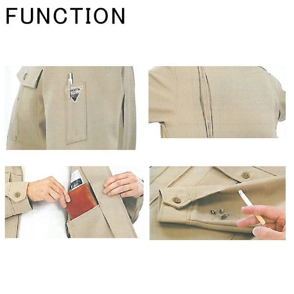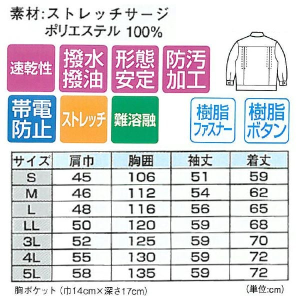 | 特徴 | 1、帯電防止 2、ストレッチ 3、難溶融 4、速乾性 5、撥水撥油 6、形態安定 7、防汚加工 8、樹脂ファスナー 9、樹脂ボタン 10、汚れた水や油に強い、撥水・撥油加工 11、便利な袖ペン差し付 12、激しい働きにもスムーズに対応する、プリーツロン 13、便利な内ポケット付 14、溶けにくい難溶融加工 15、帯電防止作業服 |