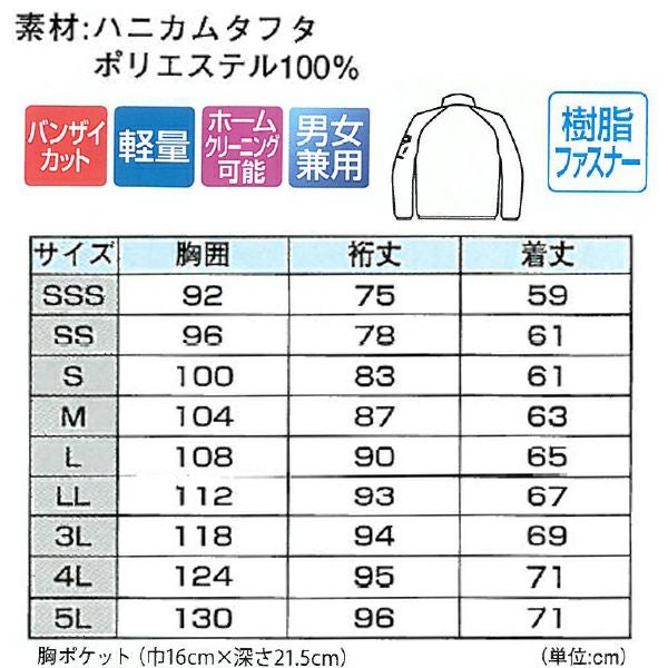 | サイズ | SSS・SS・S・M・L・LL・3L・4L・5L 胸ポケット(巾16cm×深さ21.5cm) |