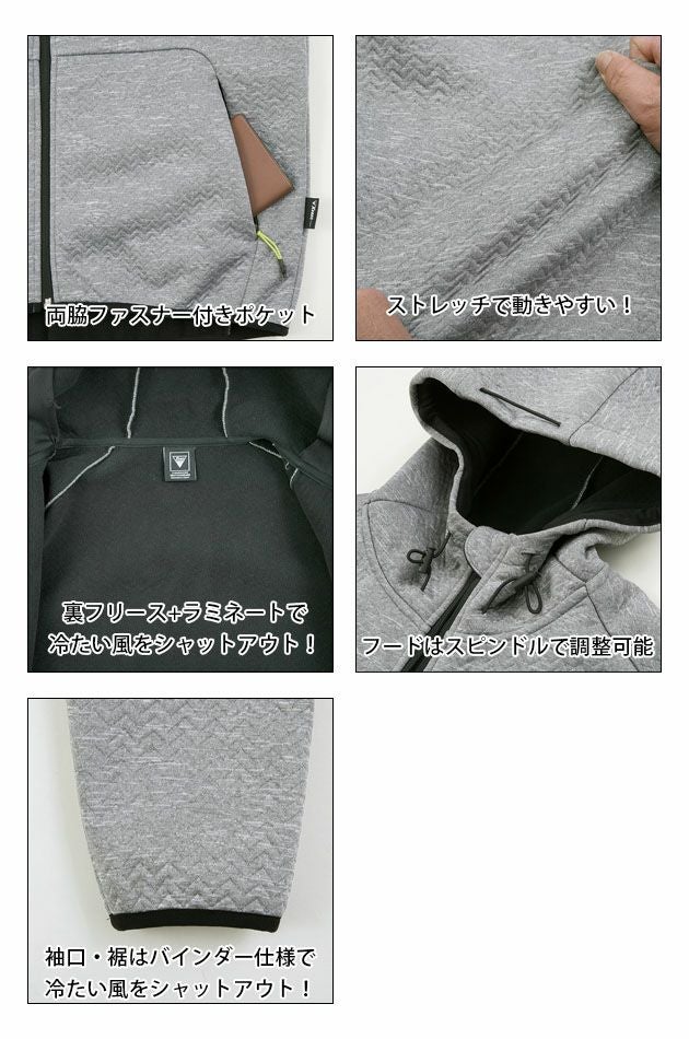 | 特徴 | 普段着でもオシャレに着れる、オールマイティな防風パーカー。 表素材は独特なディンプル素材とカジュアルな杢調の2種でハードにもカジュアルに選べます。 ◆両脇ファスナー付きポケット ◆ストレッチで動きやすい ◆裏フリース+ラミネート仕様で風をシャットアウトし保温性を高めます ◆フードはスピンドル調整 ◆袖口、裾バインダー仕様で風の浸入をシャットアウト |