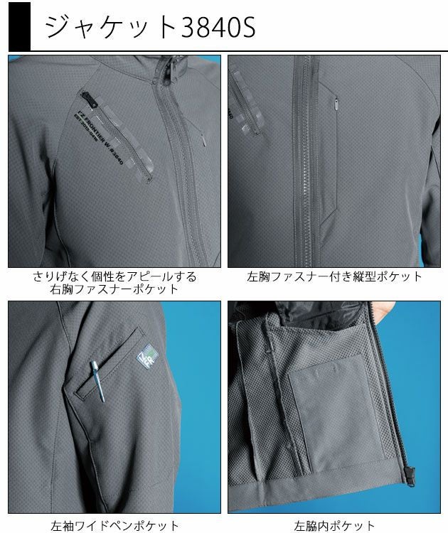 | 【特徴】 | 完全数量限定モデル、登場。 Road to Future 未来を志向するスタイリッシュライダースモデル。 その洗練された高いデザイン性が、ワークウェアの新たな可能性を創造する。 洗練された個性があふれ出すアイズフロンティア作業着から上下セット登場! ◆独特な織り構造を採用したワイルド感溢れる二重織素材を採用。色の濃淡をさりげなく表現し、高級感と先進性を兼ね備えた独特のルックスを実現します。 ◆年間を通じて快適な着用を実現する3D設計構造。 ◆高級感溢れるマットなルックスに仕上げ、裏面には2種類の太さの原糸をバランス良く織り込む事により重さを軽減したボリューム感を実現。 ◆生地裏面の点接触凹凸構造がエアーポケット効果によるウォーム感生み出し、衣服内の快適を保ちます。 ◆適度な全方向ストレッチ性能を有し、ストレスのない快適な動き易さと、安定感のあるスタイリッシュなスタイルキープを実現します。 ◆一般基準を大きく凌ぐ引裂き強さを実現。その他各項目も高い数値を測定した高堅牢性モデル。 ◆シーンを選ばない先進的なシャープなデザインに、アイズフロンティアならではの厳選されたレタリングプリントをプラス。さり気ないリッチ感を演出します。 ◆圧倒的な存在感を発揮する3色配色ジャケット74番色(トリコロール)を生産数量限定品にてラインナップ。従来には成し得なかったスタイリングを実現します。 ◆ファスナーやドット釦等に国産YKK社製を使用。細部にまで拘りを追求しています。 ◆3840Sジャケット ・さりげなく個性をアピールする右胸ファスナーポケット ・左胸ファスナー付き縦型ポケット ・左袖ワイドベンポケット ・左脇内ポケット ◆3843ジョガーパンツ ・サイズ調整しやすい内側腰紐付き ・隠しファスナー付き両脇カーゴポケット ・隠しファスナー付き両側バックポケット |