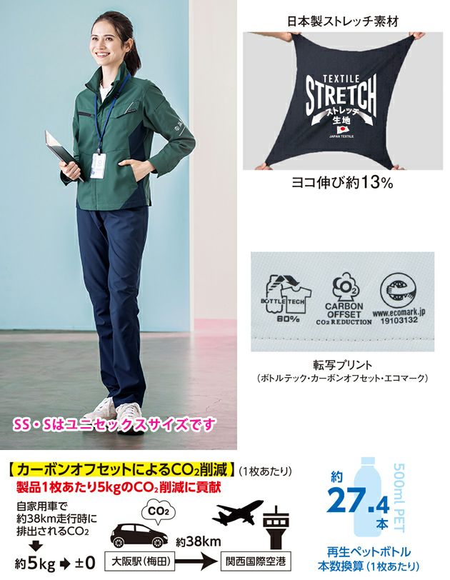 | 【特徴】 | 再生ペットボトル使用の「ボトルテック(R)」第2弾。 企業のSDGsへの取り組み環境活動への寄与が無理なくできます。 上着両脇のダイヤカット配色が、セットアップ時にスタイルアップ効果を発揮します。 ◆エコ素材:再生PET素材80%(AE-8098のみ100%)だからユニフォームから環境活動へ寄与 ◆ストレッチ:動きを妨げないヨコ伸び約13%の日本製ストレッチ素材(AE-8098のみ約10%) ◆サイドベンツアジャスター:裾部分のアジャスターボタンで調整できるから腰回りストレスフリー ◆豊富な胸ポケット:野帳が入る右胸ファスナーポケットや、フラップを収納できる左胸フラップインポケット ◆マルチポケット:両脇・両袖にあることで、利き腕に左右されな使いやすさを実現 ◆タブレットインポケット:タブレット(10.1インチ)を収納できる便利な左内側ポケット(AE-8190)。 ◆反射反射素材で夜間屋外で働く方の視認性をキープ(左胸両袖背中) ◆エコプリントボトルテックカーボンオフセット・エコマークのプリント入りで、着用するだけで環境活動へ寄与。 ・反射素材(両袖・背中・胸) ・衿台DRYメッシュ ・ワイドスプレッドカラー ・野帳も入る右胸ファスナーポケット ・両袖マルチポケット |