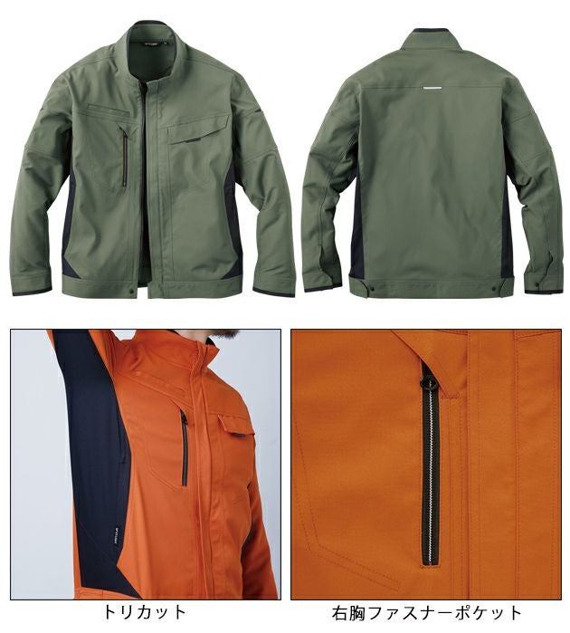| 【特徴】 | 軽やかでスタイリッシュに仕立てた進化系ブルゾン 柔軟に動けるハイレベルなストレッチでストレスフリー! ◆植物由来の再生資源を粗原料としたポリエステル繊維を使用 ◆冷たい風の侵入を防ぐ防風素材で、薄くても快適 ◆軽量ストレッチ素材なので疲れにくく、作業能率アップにも効果的 ◆帯電防止素材でJIS-T8118をクリア 反射(袖、衿裏):視認性を高める反射テープを随所に施し、あらゆる角度から着用者の存在を視覚的に知らせ、安全性を確保します。 ・右胸マルチポケット(携帯や野帳が入るサイズ) ・右胸ファスナーポケット ・内ペン差し ・左袖ネームループペン差し付ポケット ・トリカット ・両袖ペン差し ・裾、カフス調整ボタン |