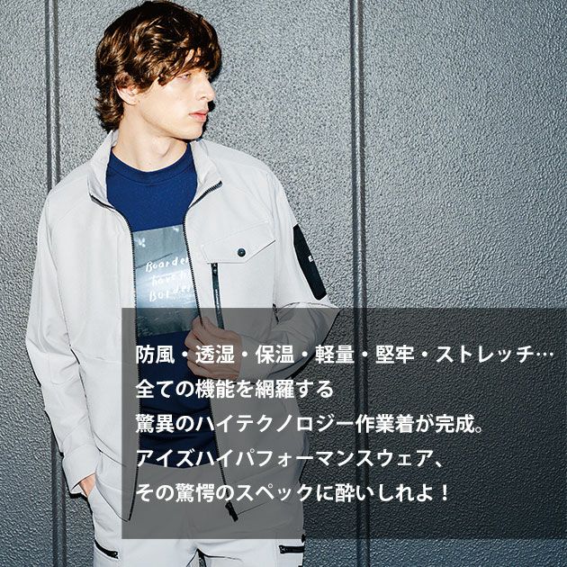 | 【特徴】 | 防風・透湿・保温・軽量・堅牢・ストレッチ… 全ての機能を網羅する驚異のハイテクノロジー作業着が完成。 アイズハイパフォーマンスウェア、その驚愕のスペックに酔いしれよ! ◆秋冬作業着に求められるすべての要素を盛り込み完成した究極の1着。 ◆素材表面は高密度フラット、裏面は3Dポイントコンタクトをそれぞれ形成する二重織構造。その裏側の構造から空気層が発露し適度な保温効果を発揮。 ◆素材表面の高密度な構造により風抜け感を軽減し、冷たい風をシャットアウト。 ◆さらにムレを適度に逃がす透湿性も併せ持ち、快適な着心地が続く。 ◆引裂き強度に優れハードワークにも十分耐えうる強度を実現。 ◆非常にしなやかで軽く、ストレッチ性に優れ動きやすい。 ◆計算しつくされたレタリングラバープリントを施し、個性を主張しすぎることなくデザイン性をアップ。 ◆個人ユーザーはもちろん、企業などのチームユニフォームとしてもおすすめできる。 ◆スマホが入る右胸縦ポケット ◆立てファスナー付き左胸ポケット ◆スタイリッシュな左袖ペン差しポケット ◆左脇内ポケット |