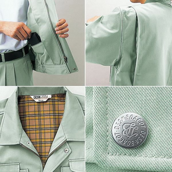 1、帯電防止素材使用 2、抗菌防臭加工 3、背当て 4、ワンポイント 5、左袖機能ポケット(ペン差付) 6、ノーフォーク 7、内ポケット 8、オリジナルデザインボタン |