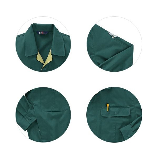 1、ボタン/金属 2、エコマーク付(右袖) 3、帯電防止素材 4、左袖ペン差し付 5、背中ノーフォーク 6、両脇内ポケット 7、左胸ペン差し付 8、右袖にエコマーク 9、ファスナー/フロント:金属 |