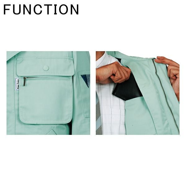 | 特徴 | 1、帯電防止 2、年間対応 3、便利な内ポケット付。 4、便利なファスナー付胸ポケット。 5、金属ファスナー 6、金属ボタン |