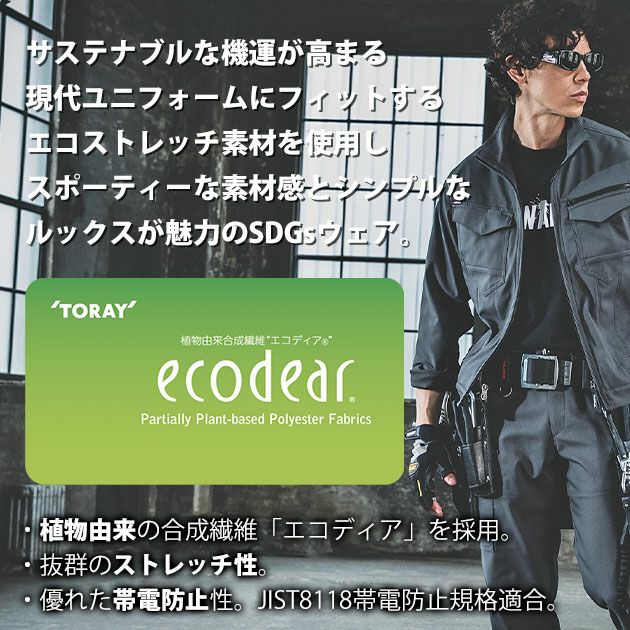 | 【特徴】 | サステナブルな機運が高まる現代の作業着。 時代に合わせたエコストレッチ素材を使用し動きやすく地球にやさしい作業服が登場。 スポーティーな素材感とシンプルなルックスが魅力的! ◆植物由来の合成繊維「エコディア」を採用したSDGs対応作業着 ◆抜群のストレッチ性を誇るクレイジーストレッチ採用 ◆JIS T 8118帯電防止規格に適合した帯電防止仕様 ◆スッキリとしたテーパードシルエットがシャープな印象を与える ◆S・Mサイズは男女ユニセックス対応 ◆右胸ペン差し付き ◆フロントファスナーはダブルジップ仕様 ◆左袖ペンポケット ◆野帳・トランシーバー収納可能な左ファスナーポケット ◆両脇ポケット ◆袖アームタック ◆カフスドットアジャスター ◆左内ポケット |