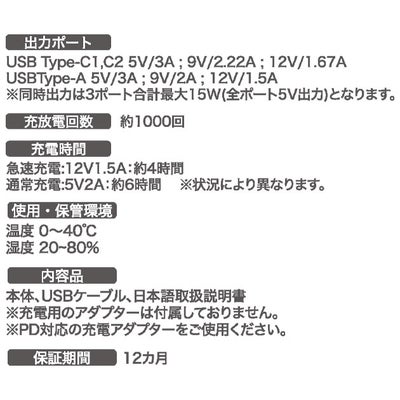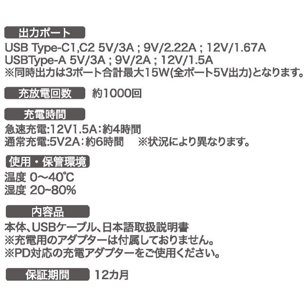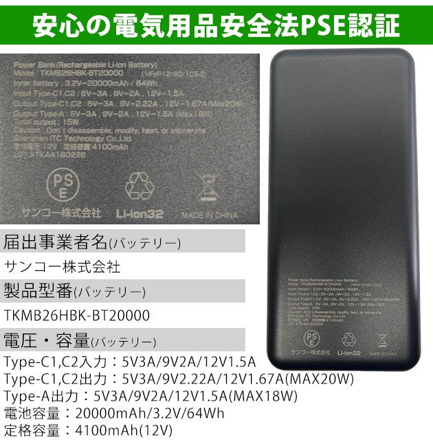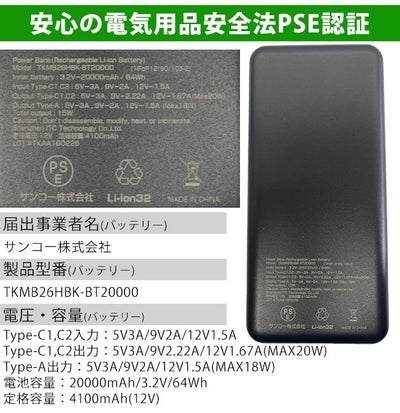 | 【デバイス情報】 | ・バッテリータイプ:リン酸鉄リチウムイオンバッテリー ・バッテリー容量:3.2V 20,000mAh(64Wh) ・本体サイズ:約149×69×29mm ・ケーブル:30cm(USB-CtoC) ・重量:400g ・入力ポート:USB-C1,2 5V3A 9V2A 12V1.5V ・出力ポート(USB-C1,2):5V3A 9V2.22A 12V1.67V ・出力ポート(USB-A):5V3A 9V2A 12V1.5V ・充放電回数:約1,000回 ・充電時間(急速充電):12V1.5A 約4時間 ・充電時間(通常充電):5V2A 約6時間 ・定格容量:4,100mAh ・定格電圧:12V ・届出事業者名(バッテリー):サンコー株式会社 ・製品型番(バッテリー):TKMB26HBK-BT20000 ・PSマークの種類(バッテリー):PSE |