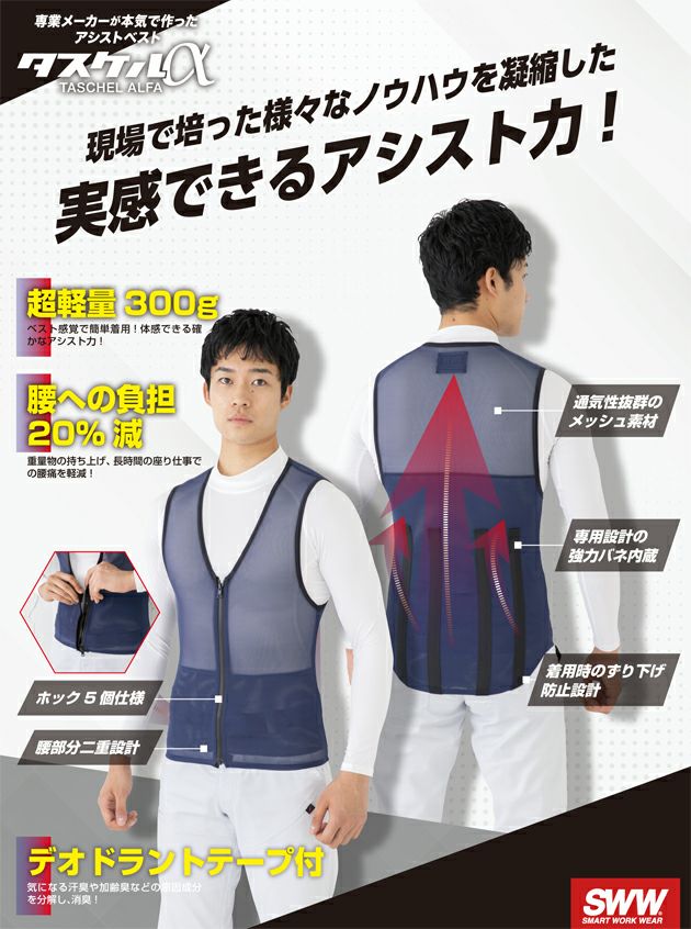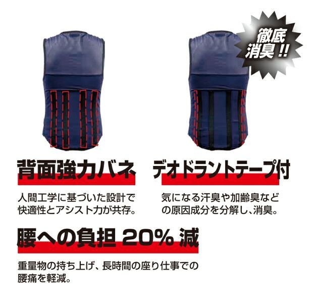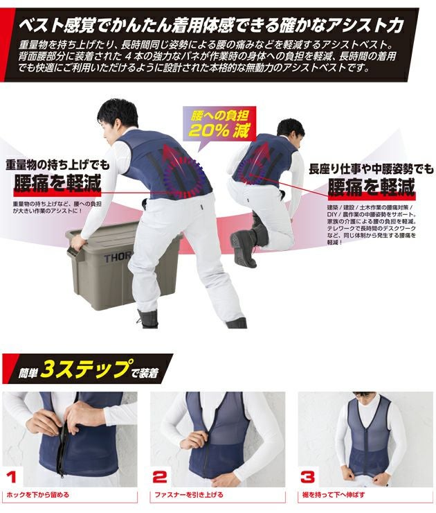 | 特徴 | 現場で培った様々なノウハウを凝縮した実感できるアシスト力! ◆ベスト感覚でかんたん着用できる確かなアシスト力 重量物を持ち上げたり、長時間同じ姿勢による腰の痛みなどを軽減するアシストベスト。 背面腰部分に装着された4本の強力なバネが作業時の身体への負担を軽減、長時間の着用でも快適にご利用いただけるように設計された本格的な無動力のアシストベストです。 ◆重量物の持ち上げでも腰痛を軽減 ◆長座り仕事や中腰姿勢でも腰痛を軽減 ・背面強力バネ ・デオドラントテープ付き ・腰への負担20%減 |
