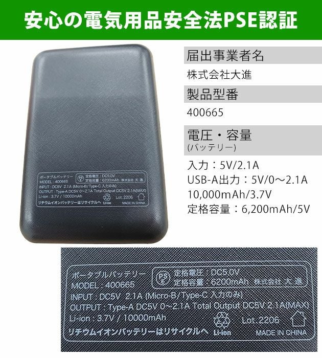 | バッテリー容量:10,000mAh/3.7V 定格容量:6,200mAh/5V |