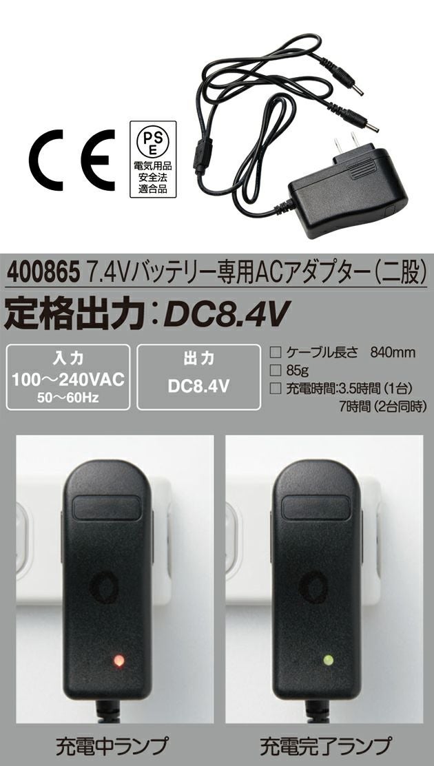 | 特徴 | 【セットバッテリー】 400765 ヒートウエア専用バッテリー7.4V専用 2台 400865 7.4Vバッテリー専用ACアダプター(二股)1台 ・バッテリーポケット ・つま先ヒーター部 |