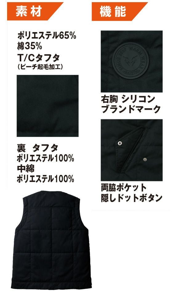 特徴 さまざまなジャケットにスマートにフィット。衿無しインナー防寒ベスト。