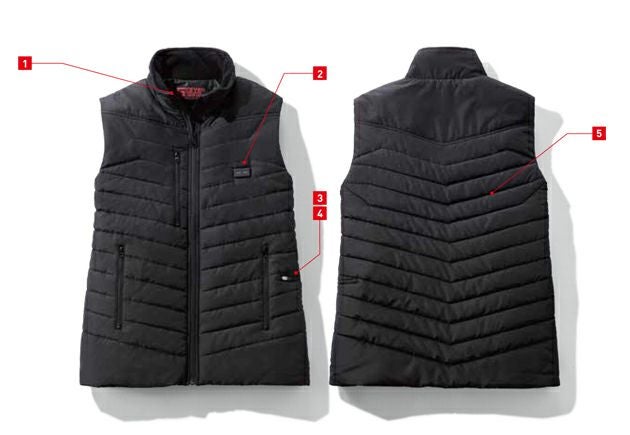 | 特徴 | 保温性の高い発熱体内蔵型電熱ベスト ブラックアルミメッシュ裏地+9ヶ所発熱で暖かく保温性抜群。 ・背ネーム ・電源ボタン ・バッテリー収納ポケット ・USBケーブル(コネクタ) ・保温性の高いブラックアルミメッシュ裏地使用 ◆発熱ヶ所…前面:脇ポケット部(2ヶ所)背面:襟(1ヶ所)、肩(2ヶ所)、背中:(2ヶ所)、腰(3ヶ所)の9ヶ所が発熱し、約15秒でベスト全体が温まります。 ◆付属品…バッテリー・USBケーブル 【バッテリー】 電圧/容量:3.7V/10,000AH 定格電圧/定格容量:5V/6,100mAh 入力:5V 2A 出力:5V 2.2A[MAX]※ポート2個口 サイズ:縦134mm×横68mm×厚さ16mm 充電時間:約6時間(2Aアダプター使用時)※高速充電器には非対応 |