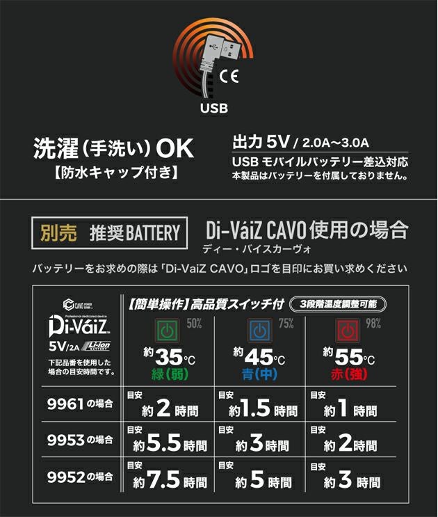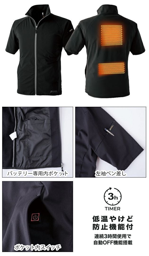 | 特徴 | この冬の電熱ウェアは自由自在な半袖ストレッチジャケットで。 冬に欠かせなくなった電熱シリーズの中でも珍しい半袖ジャケットの電熱ウェア。 コンプレッション・ジャケット・アウターのミドルレイヤーとして着用したり、環境温度によってはアウターとして着用し電熱機能で温かさを調整する着回しが可能です。 軽量で、着心地の良いストレッチ性能と帯電防止機能もあるのでストレスなく動きまわれます。 電熱シートは背中上部と、腰付近の二か所。左裏に接続ケーブルが出たバッテリー収納用の内ポケットがあります。裾は暖かさを逃さないストレッチパイプ仕様です。 ・左袖ペン差し ・バッテリー専用内ポケット ・低温火傷防止機能付き。連続3時間使用で自動OFF機能搭載 |