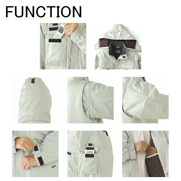 | 特徴 | 1、撥水加工 2、フード取り外し(ヘルメット対応) 3、フード後ろマジックテープアジャスター 4、ノーフォーク 5、左袖ペン差しタバコ収納 6、携帯電話収納ポケット 7、アクションタック 8、内ポケット 9、袖口マジックテープ 10、樹脂ファスナー 11、樹脂ボタン |