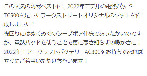 | ご使用時の注意 | バッテリーは別売りです。 セットに含まれる電熱パッドTC500は2022年モデルです。 対応するバッテリーはAC300(2022年モデル)・AC360(2023年モデル)です。 その他のバッテリーと互換性はありませんのでご注意下さい。 サーモクラフト着用時は必ずエアークラフトバッテリーをご使用ください。 低温やけどにも十分にご注意くださいませ。 ご使用前に必ず電熱パッド、およびエアークラフトバッテリーの取扱説明書に記載の内容を最後までよくお読みいただき、正しく安全にご使用くださいますようお願い申し上げます。 |