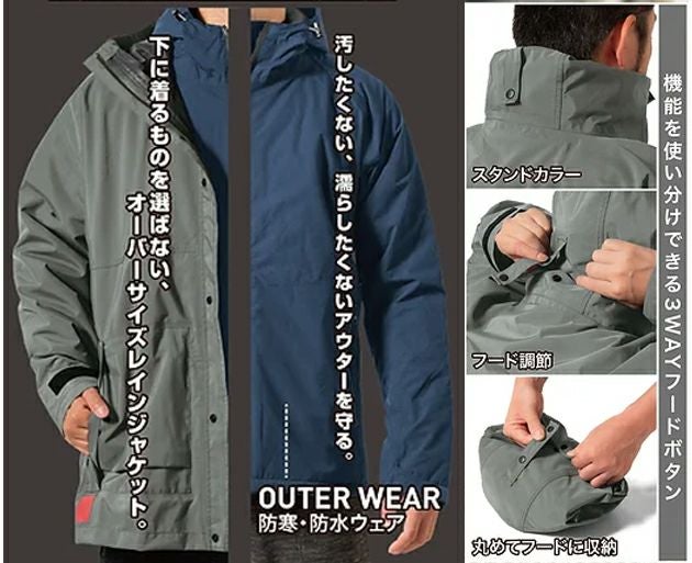 | 【特徴】 | 構わず、汚せ。 高撥水加工で汚れが付きにくい! イージーケアで出番を増やせ! 汚したくない、濡らしたくないアウターを守る! オーバーサイズのレインジャケットだから下に着るものを選ばない! ◆抜群の耐水圧10,000mmでしっかり防水! ◆縫い目の裏側は防水シームテープ加工で水の侵入を防ぐ! ◆フードは丸めて衿部分に収納可能 ◆さらにフード部分にジャケット本体を丸めて収納することも可能! ◆オーバーサイズフード ◆蛍光反射プリント ◆バタつきを抑えるウエスト調節コード |
