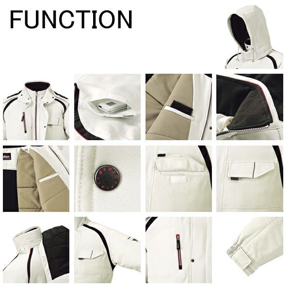 | 特徴 | 1、撥水加工 2、中綿30%増量 3、樹脂ファスナー 4、金属ボタン 5、ヘルメット対応大型フード(マジックテープアジャスター付) 6、フード取り外し 7、衿フリース 8、風や雨の侵入を防ぐダブルフロント仕様 9、内ポケット 10、左胸ポケット内携帯フォルダー 11、保温性に優れた中綿仕様(胴キルト160g/㎡) 12、立体カッティング構造 13、右胸ファスナーポケット(オリジナル引き手) 14、フラップ反射パイピング 15、フラップマジックテープ・グログラン引き手付 16、オリジナル刻印ボタン 17、袖ラグラン仕様 18、袖口マジックテープ調節 |