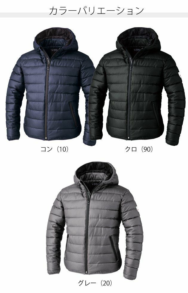 | 特徴 | ファッションとワークの融合したカジュアルタイプ防寒 現場の移動や普段着としても着れるカジュアル防寒 ■ハードな凹凸感でおしゃれな風合いに ■熱反射により、衣服内の熱を外に逃がしません ■背中には蓄熱保温素材使用 ■前中央、両脇ファスナーポケットに止水タイプファスナー ■袖口バインダー仕様 ■フード付き ■フードはたたんで衿部分に収納可能 |