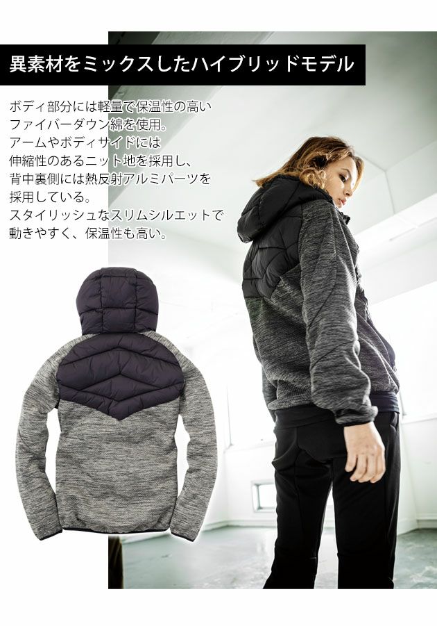 腕部分やサイド部分には伸縮性のあるニット素材を採用し、背中裏には保温性抜群のアルミパーツを採用。