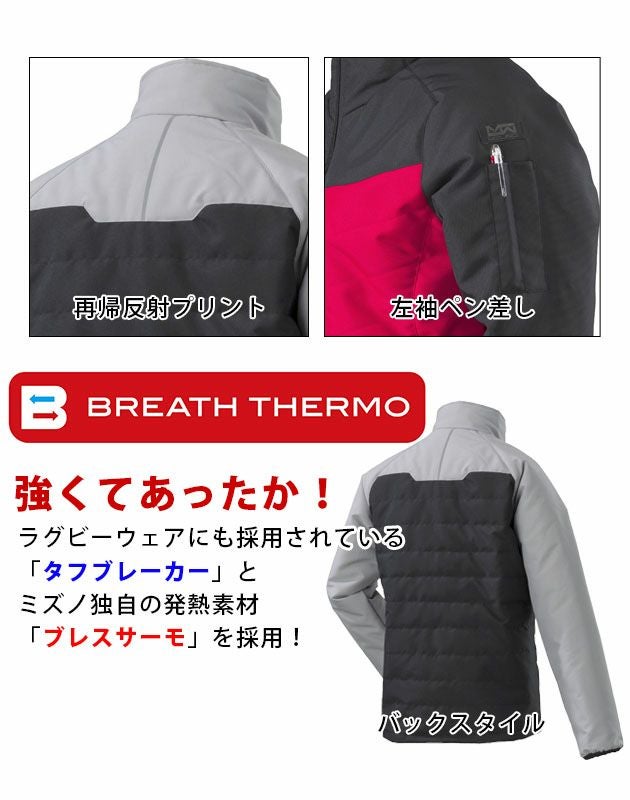 | 特徴 | ラグビーウェアにも採用された「タフブレーカー」! さらに大人気ミズノ「ブレスサーモ」採用! ◆タフブレーカーとは? ラグビーウェアにも採用されている強い生地! 作業服にもその技術を応用しました! ◆ブレスサーモとは? 汗などの水分を熱に変える! あったか素材として大人気! ◆動きやすさを科学した「ダイナモーションフィット」! スポーツブランドだからこそできた身体の動きの研究により動きやすいシルエットを実現! ◆再帰反射プリント(背中) ◆左袖ペン差し |