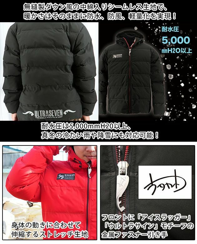 | 特徴 | ウルトラマンの強さと、安心感を。 力強く、安心の象徴でもある「ウルトラマンと、あらゆる現場・環境に適した商品を生み出す「弘進ゴム」がコラボ! 高機能な「ULTRAMAN」シリーズは弘進ゴムの技術でウルトラマンの世界観を再現した新しいワークウェアです。 ◆防水×ストレッチ!ウルトラセブンモデルの防寒ジャケット! 動きやすい生地に防水性と保温性をプラス。 ファイバーダウンを採用しているから軽くて着心地抜群! ◆ワークシーンのみならず、アウトドアやレジャーでも映えるスタイリッシュなデザイン ◆雪にも対応する耐水圧5,000mm ◆フロントには「アイスラッガー」をモチーフにした金属ファスナー引手 ◆ファスナー付きの両サイドポケット ◆巻き込み式で収納可能なパーカーフード |
