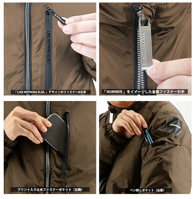 | 【特徴】 | SUVブランドの「HUMMER」をイメージした軽量で柔らかいタッチのライトウエイト防寒ブルゾン ◆プレミアム超はっ水「イーコーティング」を採用し、防水ウェアに負けない抜群の撥水性を発揮 ◆軽量かつ肌触りの良い生地を採用し、快適な着心地を実現 ・「HUMMER」をイメージしたプリントデザイン、金属ファスナー引手 ・バックプリントはブラック反射プリント ・「HUMMER」ロゴ入りの裏地 ・「LIKE NOTHING ELSE.」デザインのポケットファスナー引手 ・プリント入り左胸止水ファスナーポケット ・両サイドポケット ・左肩ペン刺しポケット |