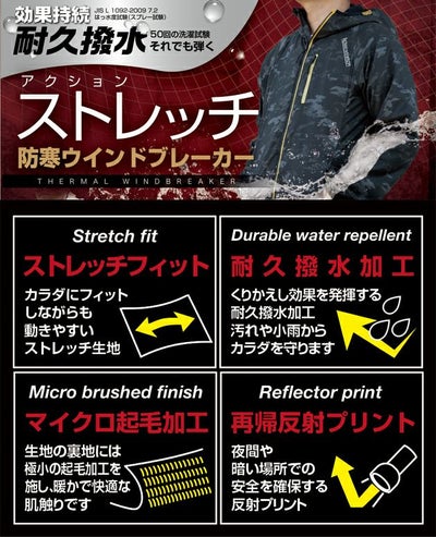 | 【特徴】 | 50回の洗濯試験! それでも弾く効果持続耐久撥水アクションストレッチ防寒ウインドブレーカー ◆ストレッチフィット 体にフィットしながらも動きやすいストレッチ生地 ◆耐久撥水加工 くりかえし効果を発揮する耐久撥水加工 汚れや小雨から体を守ります ◆マイクロ起毛加工 生地の裏地には極小の起毛加工を保護腰、暖かで快適な肌触りです ◆再帰反射プリント 夜間や暗い場所での安全を確保する反射プリント ◆JIS L 1092-2009 7.2はっ水度試験(スプレー試験) ◆再帰反射プリント ◆マイクロ起毛加工※裏生地 |
