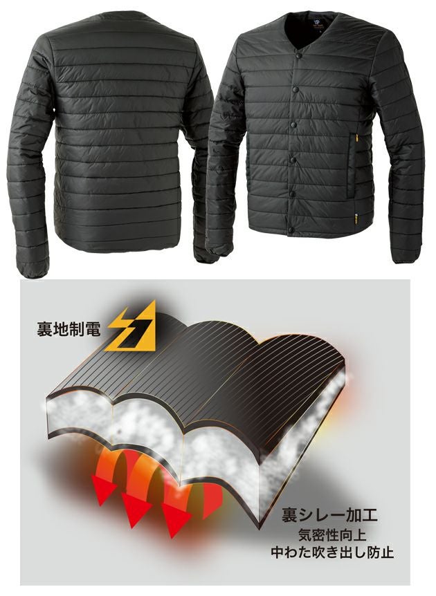 | 特徴 | 様々な様々な仕事着のインナーに対応!制電中綿の機能性インナ―。 制電裏地により不快なパチパチやまとわりを防ぐ中綿入りインナー。 スタンダードで着膨れしないデザインと、衿部分をインナーとして着こなしやすい深めのVネックにすることで現場作業服のインナーとしても、スーツ着用時のインナーとしてもシーンを選ばず着回せます。 表地裏にはシレー加工を施し中綿の吹き出し防止のほか、気密性を向上させることで熱を逃がしにくくし、暖かさを保ちやすくします。 左脇のみ通常ポケットとコンシールファスナー付きポケットのダブル仕様になっています。 手洗い可能で長く綺麗に着用いただけます。 ・左脇Wポケット |