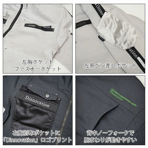 | 【特徴】 | スタイリッシュでおしゃれ! 抜群のストレッチ性でストレスフリーなカラーデニム作業服! ◆抜群の伸縮性を誇る中厚のカラーデニム素材だから通年着こなせる ◆ストレッチ性能抜群で、着用時のストレスを感じさせない「ストレスフリーカラーストレッチデニム」 ◆スタイリッシュに着こなせるナチュラルフィットシルエット ◆腕部分はロゴラインテープでデザインにアクセント ◆反射素材をディティールに使用し視認性UP。 ◆左右裏側に便利な内ポケット。 ◆左腕にペン差し用ポケット。 ◆大型で便利なポケットを各所に配置。 ◆左胸ポケットはファスナーポケット ◆右胸別布ポケットに「Dinnovation」ロゴプリント。 ◆ファスナースライダ―に「Dinnovation」ロゴプリント |