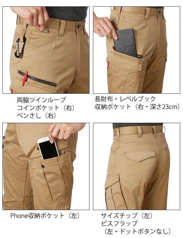| 特徴 | ■安心の日本製ソフトツイル素材使用 ■やや細身のスタイリッシュシルエット ■製品制電JIS T8118適合 ■両脇ツインループ ■コインポケット・ペン差し(右) ■サイズチップ・ピスフラップ(左) ■スマホ収納ポケット(左) ■長財布・レベルブック収納ポケット(右:深さ23cm) |