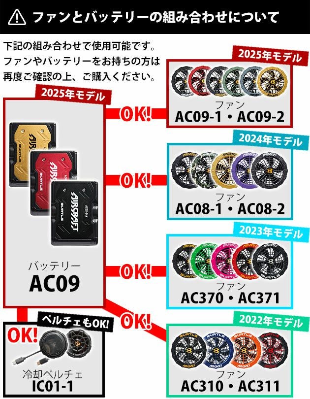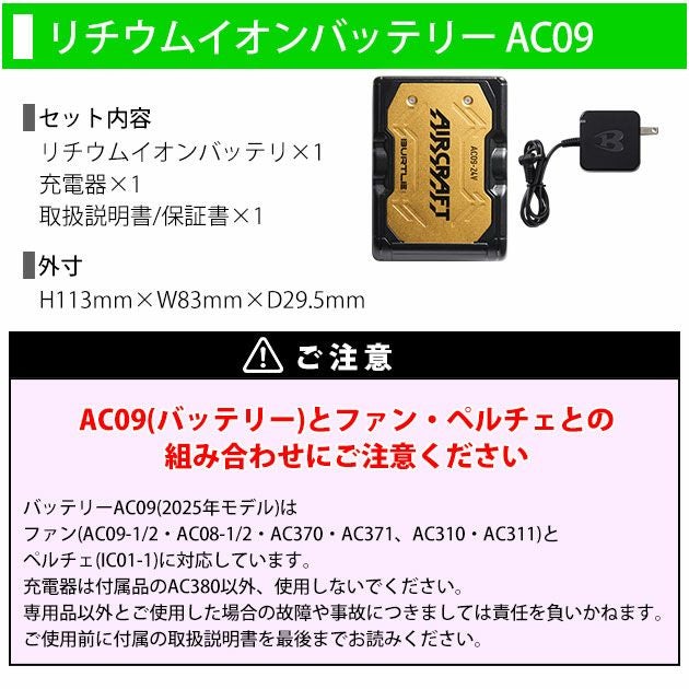 | 【ご使用時の注意】 | ◆バートルエアークラフトシリーズの空調作業服でご使用ください。 ◆対応機種は下記のとおりです。下記のファン・ペルチェユニットのみで使用可能です。 IC01-1、AC09-1/AC09-2、AC08-1/AC08-2、AC370/AC371、AC310/AC311 ◆充電器は付属のものをご使用ください。 ◆ファン・ウェアは別売りです。 ◆付属の説明書をお読みいただき、正しくご使用下さい。 |