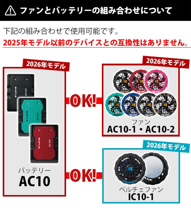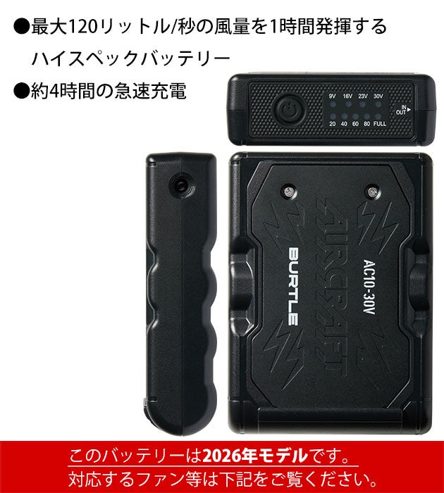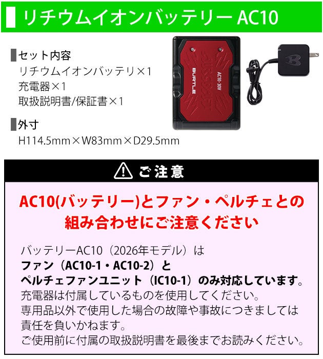 | 【ご使用時の注意】 | ◆バートルエアークラフトシリーズの空調作業服でご使用ください。 ◆対応機種はIC01-1、AC10-1、AC10-2のみです。それ以外のデバイスとの併用はできません。 ◆充電器は付属のものをご使用ください。 ◆ファン・ウェアは別売りです。 ◆付属の説明書をお読みいただき、正しくご使用下さい。 |