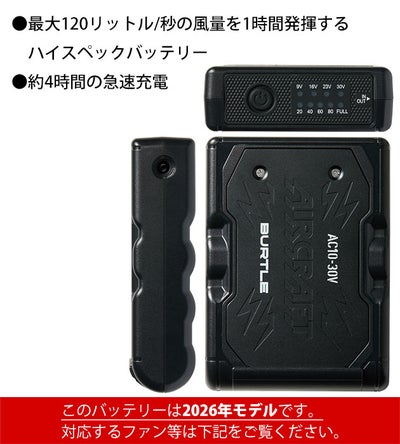 | 【特徴】 | 2026年のエアークラフトは30V! 毎シーズンアップデートを続ける京セラIT社製パワーバッテリーで毎秒120リットルの最大風量を実現! ◆最大毎秒120リットルの風量を1時間発揮するハイスペックバッテリー ◆約4時間の急速充電仕様 ◆AC10バッテリースペック ・質量:405g ・充電時間:約4時間 ・外寸:H114.5×W83×D29.5mm ・セット内容:リチウムイオンバッテリー×1、充電器×1、取扱説明書/保証書×1 ・対応機種:AC10-1・AC10-2・IC10-1 ◆稼働時間 ・30V:1時間+23V:約5時間(平均77リットル/秒) ・23V:1.5時間+約6.5時間(平均77リットル/秒) ・16V:約11時間 ・9V:約30時間 ※30Vでは稼働後1時間後に自動的に23Vに切り替わります。 ※23Vでは稼働後1.5時間後に自動的に風量調整を行い、平均77リットル/秒で稼働します。 |