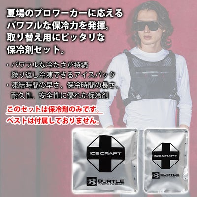 | 【特徴】 | 取り替え用としてオススメ! 夏のプロワーカーの期待に応える、パワフルな保冷力! 過酷な夏に大活躍間違いなしの保冷ベスト用保冷剤登場! ◆表面温度5℃と0℃帯のパワフルな冷たさを持続し繰り返し冷凍可能な特殊アイスパック ◆凍結時間の早さ、保冷時間の長さ、耐久性、内容成分の安全性に優れた特殊低温保冷剤 ◆セット内容:IC105保冷剤(500g)×1、IC106保冷剤(1kg)×1 ◆IC105保冷剤(500g)スペック ・外寸:170mm×245mm ・冷却時間:約5時間 ・冷凍時間:約7~9時間 ◆IC106保冷剤(1kg)スペック ・外寸:245mm×245mm ・冷却時間:約8時間 ・冷凍時間:約13~16時間 ※外気温や冷凍庫温度によって数値は変動します。 |