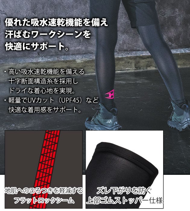 | 【特徴】 | 優れた吸水速乾機能を備え汗ばむワークシーンを快適にサポートするドライテックギアシリーズ! ◆高いく薄い速乾機能を備える十字断面構造糸を使用しドライな着用感を持続 ◆軽量、ストレッチ、UVカットなど快適な機能を有するドライフィット素材 ◆ずれ下がりを防ぐゴムストッパー仕様 ◆男女ユニセックス ・右ももプリント ・フラットロックシーム縫製 ・伸長率40%以上 |
