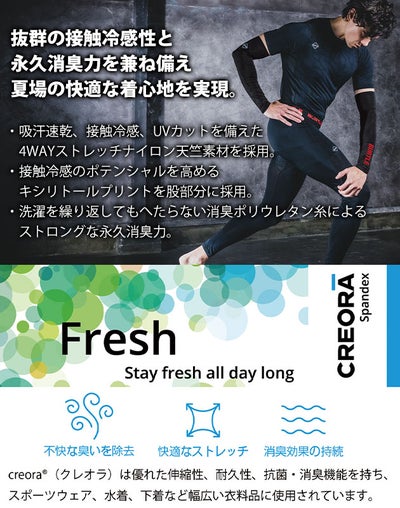 | 【特徴】 | 抜群の接触冷感性と永久消臭力を兼ね備え快適な着用を追求したアイスフィッテットプロダクト ◆吸水速乾、36敗ゲージの接触冷感、UVカットを備えた4WAYストレッチナイロン天竺素材 ◆接触冷感んおポテンシャルを高めるキシリトールプリントを脇・股メッシュに装着 ◆洗濯を繰り返してもへたらない消臭ポリウレタン糸によるストロングな永久消臭力 ・消臭テープ ・キシリトールメッシュ ・前開き仕様(Sサイズは前開きなし) ・フラットロックシーム縫製 |