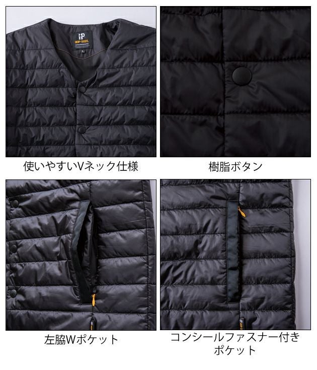 | 特徴 | 様々な様々な仕事着のインナーに対応!制電中綿の機能性インナ―。 制電裏地により不快なパチパチやまとわりを防ぐ中綿入りインナー。 スタンダードで着膨れしないデザインと、衿部分をインナーとして着こなしやすい深めのVネックにすることで現場作業服のインナーとしても、スーツ着用時のインナーとしてもシーンを選ばず着回せます。 表地裏にはシレー加工を施し中綿の吹き出し防止のほか、気密性を向上させることで熱を逃がしにくくし、暖かさを保ちやすくします。 左脇のみ通常ポケットとコンシールファスナー付きポケットのダブル仕様になっています。 手洗い可能で長く綺麗に着用いただけます。 ・左脇Wポケット |