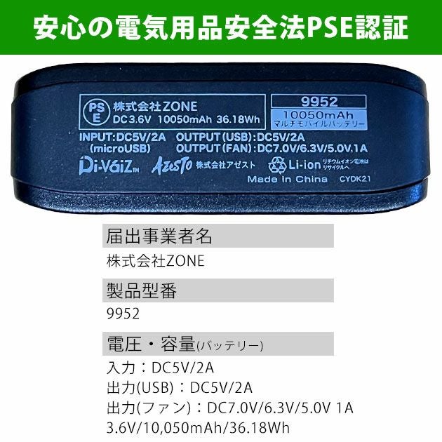 USB口の端末などへの充電も可能なので、プロワーカーが年中使えるマルチモバイルバッテリーとなっています。 ◆電熱ウェア対応、EFウェア対応 ◆iPhone/Androidスマートフォン対応 ◆IQOS/glo加熱式タバコ対応 ◆過充電/過放電の保護回路つき ◆飛行機内持ちこみOK ◆DCプラグ差込口、USB差込口 ◆PSE認証済み ◆軽量 ◆小型 ◆入力電圧:DC5V/2A(microUSB Type-B) ◆出力電圧:(USB)DC5V/2A(microUSB Type-A)/(DCプラグ)DC7.0V/6.3V/5.0V,1A ◆使用時間(目安):強3時間・中4時間・弱6時間 ◆バッテリー容量:9600mAh ◆ワット時定格量:36.48Wh ◆定格電圧:3.63V ◆重量:約182g ◆サイズ:H103mmxW71mmxD24mm ◆充電時間:約5~5.5時間 ◆充放電回数:約300回以上 ◆出力切替え:3段階 ※充電用ACアダプタは付属していません。お手持ちのmicroUSB Type-Bで充電して頂くか、別売りの専用充電器をご購入ください |